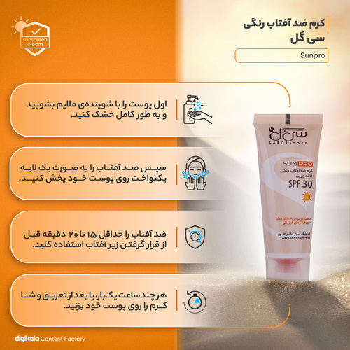 اگر میخواهید که اشعههای آفتاب بر روی پوست شما اثر مخرب نداشته باشند، استفاده از ضد آفتاب را جدی بگیرید. ضد آفتاب میتواند پوست شما را در برابر اثرات منفی که اشعههای مضر خورشید بر روی آن میگذارد، محافظت کرده و از بوجود آمدن چینها بر روی پوست جلوگیری کند. برند سی گل سری ضد آفتابهای خود را تحت نام Sun Pro ، برای حالتهای مختلف عرضه کرده که هر کدام از آنها با دارا بودن خواصی، میتوانند از پوست مراقبت کرده و حتی آنرا تقویت و یا ترمیم کنند. یکی از این محصولات، کرم ضد آفتاب رنگی با SPF30 است. این تیوپ 40 میلی لیتری حاوی ترکیباتی از عصاره شاه بلوط هندی، جوانه گندم و ویتامین E است. همچنین دارای فیلترهایی برای محافظت از پوست در برابر اشعههای ,UVA UVB و IR است. این کرم رادیکالهای آزاد را از پوست دور کرده و قدرت دفاعی پوست را بالا میبرد. استفاده از آن سبب میشود تا به دلیل دارا بودن آنتی اکسیدان، از ضایعات پوستی جلوگیری کند. استفاده از ضد آفتاب میتواند ضمن ابجاد سد محافظتی قوی در برابر آفتاب، به عناون پایهی آرایش هم در نظر گرفته شود. یادتان باشد. هر روز باید از این محصول استفاده کرده و حداقل 30 دقیقه قبل از خروج از منزل و قرار گیری در معرض آفتاب آن را بر روی پوست خود بمالید. همین طور در صورت تعریق زیاد، آن را تجدبد کنید. با خرید این محصول بهترین مراقبت را از پوستتان به عمل آورید.