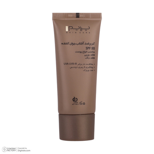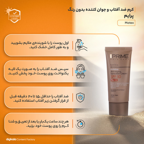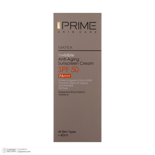 کرم ضدآفتاب یکی از پرکاربردترین و بهترین کرم‌های مراقبتی پوست است که به محافظت از پوست در برابر نور خورشید کمک شایانی می‌کند. همه افراد حتما باید در طی روز از این کرم مفید استفاده کنند تا در جهت بهبود سلامت پوست و جلوگیری از بروز بیماری‌های پوستی قدمی برداشته باشند. ضدآفتاب‌ها دارای فاکتور محافظتی در برابر خورشید یا همان SPF هستند که میزان محافظت آن کرم در برابر نور خورشید را نشان می‌دهد که بهتر است حداقل SPF30 را برای مراقبت از پوست دارا باشند. کرم ضد آفتاب بدون رنگ جوان کننده اس پی اف 50 پرایم، با بافت سبک خود به سرعت جذب پوست می‌شود، روی پوست ایجاد چربی و سنگینی نمی‌کند و از پوست در برابر اشعه مضر UVA و UVB محافظت می‌کند. این محصول حاوی عصاره تاک و ویتامین E ست، عصاره تاک مکانیسمی شبه بوتاکس و شبه رتینوئیدی دارد و در رفع چین و چروک سطحی پوست موثر است. ویتامینE سرشار از آنتی اکسیدان است، موجب رطوبت رسانی پوست می‌شود و در جوانسازی و جلوگیری از پیری پوست موثر است. ضدآفتاب جوان کننده پرایم به ترمیم و احیای پوست کمک می‌کند و یکی از مزیت‌های آن بهبود بافت ارتجاعی پوست است که موجب افزایش استحکام پوست می‌شود. این محصول فاقد رنگدانه و چربی است و به عنوان زیرساز آرایش می‌توان از آن استفاده کرد و در نهایت جلوه‌ای مات و شاداب به پوست می‌دهد.