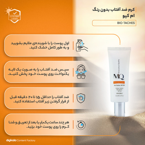 محصولات MQ ساخته شده از مواد با کیفیت می باشد. این محصولات در یکی از معتبرترین لابراتوارهای فرانسه و زیر نظر اساتید فن در صنعت مراقبت از پوست و مو فرموله شده است. این کمپانی کرم های ضد آفتاب خود را روانه بازار کرده است که ساخته شده از مرغوبترین و جدیدترین مواد اولیه و دارای حداکثر حفاظت در برابر پرتوهای مضر آفتاب هستند. این محصولات دارای ساختاری سبک بوده نرمی و لطافت را به پوست بازمی گرداند. یکی از این محصولات بسیار با کیفیت این برند، کرم ضد آفتاب بایوتچ SPF 50 است. که در سه رنگ بژ طبیعی، بژ روشن و بدون رنگ موجود است. که قویترین و موثرترین ضدآفتاب با دو عملکرد (ضدآفتاب + ضدلک) است و مناسب برای پوست های دارای لک همراه با خاصیت روشن کنندگی می باشد. لذا انواع لک، کک ، لک های ناشی از آفتاب، جای جوش،بارداری و افزایش سن را برطرف می کند. لذا قابل استفاده بعد از درمان های پوستی مانند لیزر، میکرودرم، پیلینگ شیمیایی و ...است همچنین از ایجاد لک خصوصا در افرادی که مستعد ابتلا به لک های ناشی از آفتاب هستند، پیشگیری می کند. و علاوه بر این محافظ قوی پوست در برابر تاثیرات مخرب اشعه های مضر UVA و UVB به حساب می آید. و با خاصیت مرطوب کنندگی و التیام بخشی برای انواع پوست مناسب است.جهت استفاده نیم ساعت قبل از قرار گرفتن در معرض اشعه آفتاب روی پوست تمیز مالیده شود و هر دو ساعت یکبار آن را تجدید کنید.